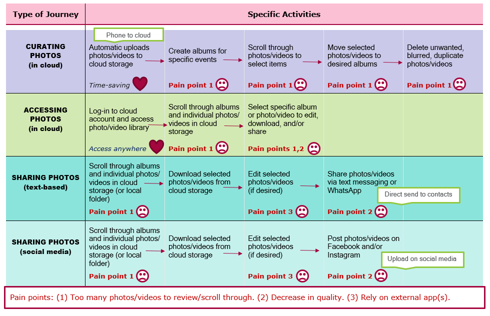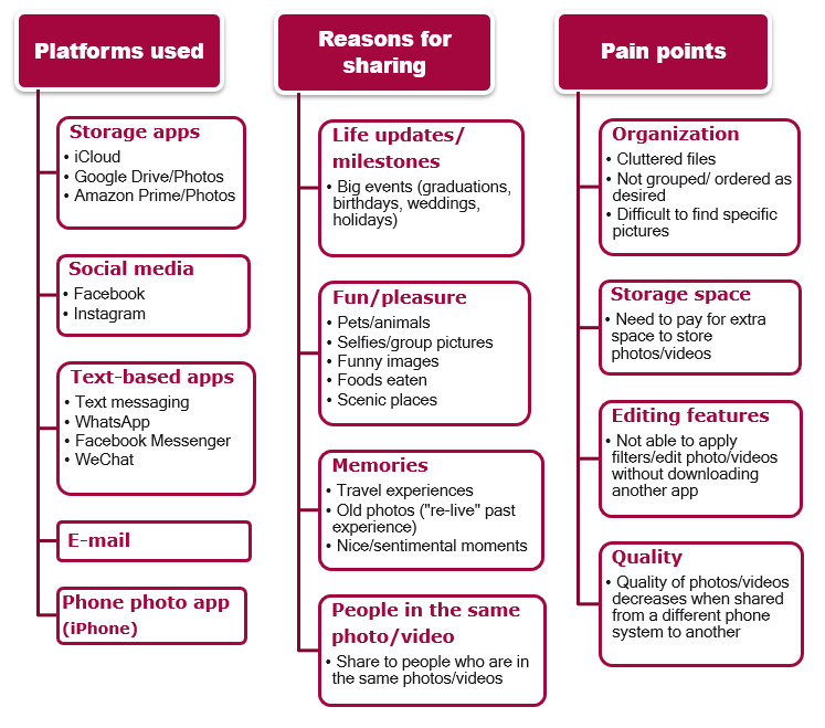 Major pain points among participants include difficulty in organizing so many photo/video files, lack of storage space, not having desired editing features, and decrease in the quality of the images and videos when shared with others.