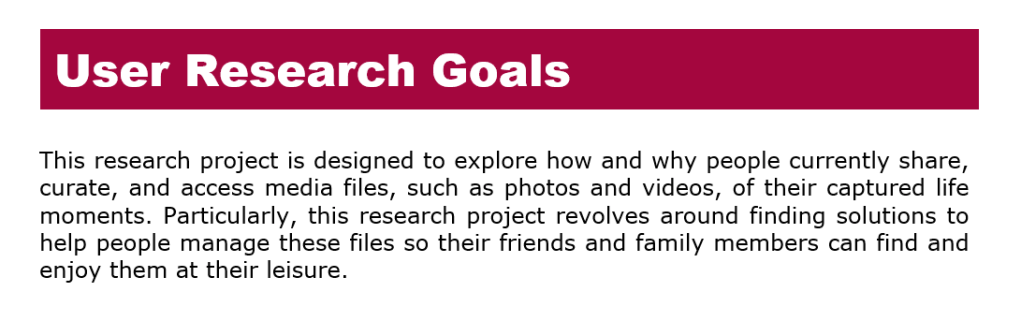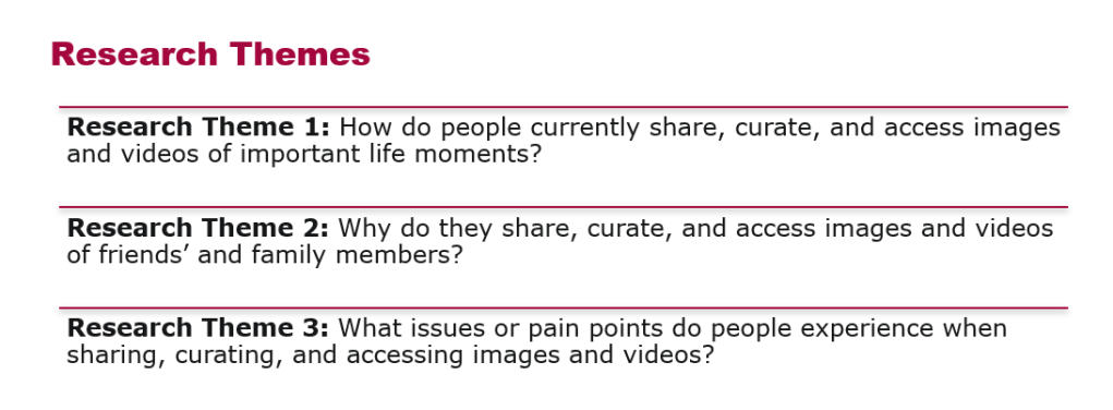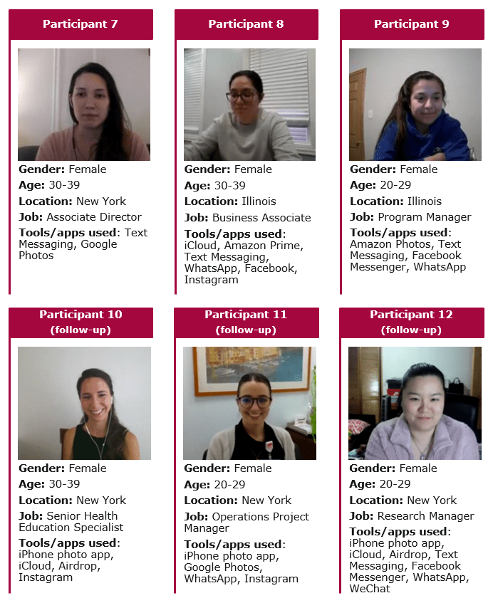 The UX Team conducted a user research project to gain insights on how and why people share, curate, and access photos and videos. Twelve (12) participants were recruited and interviewed remotely.