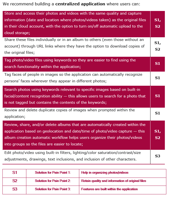 We recommend building a centralized application where users can store and access photos and videos with the same quality and capture information (date, location) as the original files in their cloud account, as well as share these files to others through URL links so they can download copies of the original files. Moreover, this application will allow users to tag photos/videos using keywords; have facial/content and duplicate copies recognition ability; and have an automated album creation workflow for photo/video files based on geolocation and date/time capture. Additionally, this product will have built-in editing features